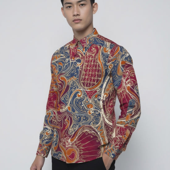 Aruna Swirl presents a rhythmic play of flowing curves and organic movement, creating a batik design that feels both expressive and composed. The swirling motif adds visual depth without overpowering the silhouette, making it suitable for cultural celebrations, office settings, or relaxed evenings. A classic collared neckline and easy, relaxed fit ensure day-long comfort, while the balanced colour palette allows seamless styling across formal and casual occasions.