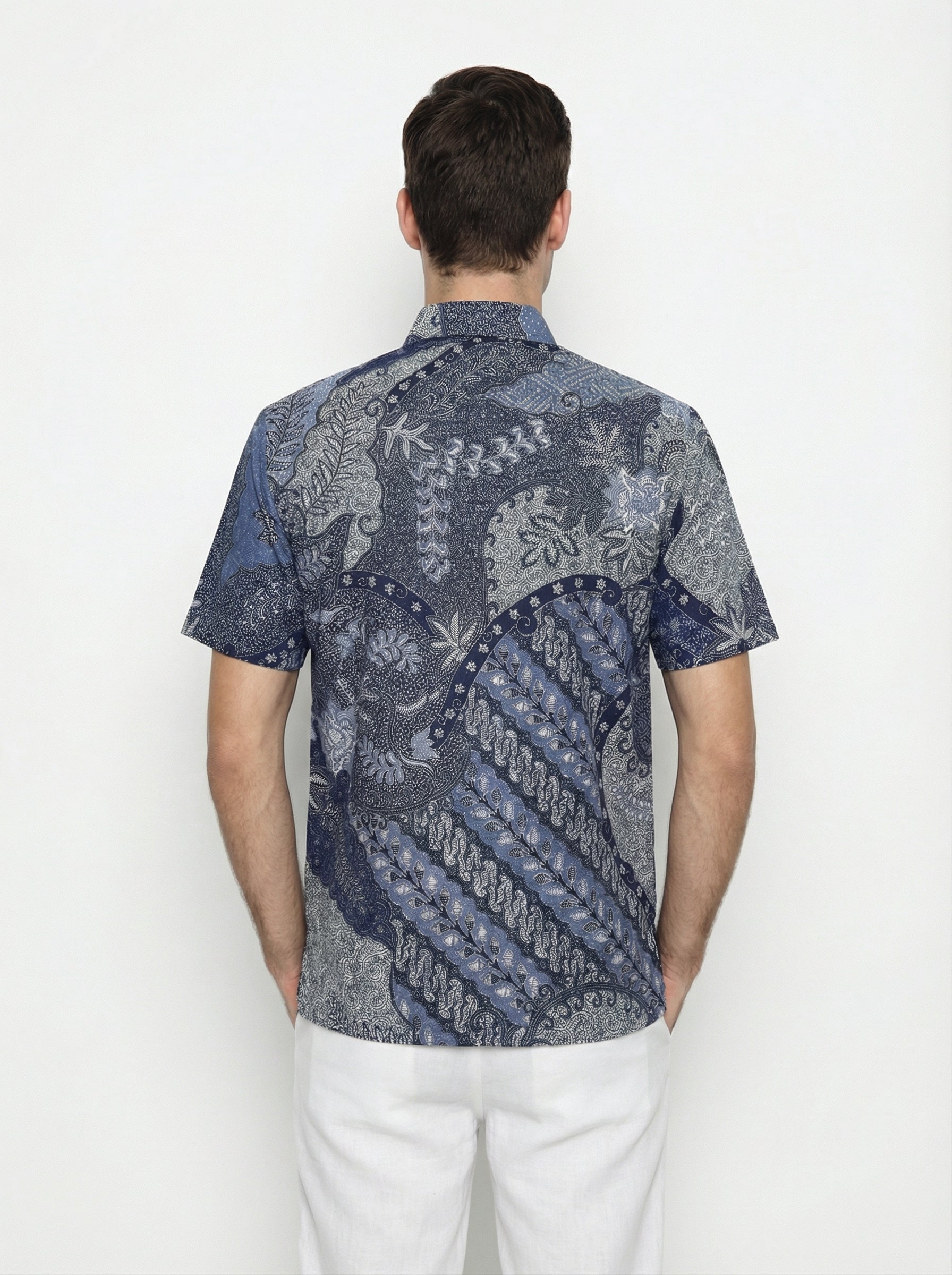 The subtle contrast of cool hues makes it versatile for both formal and casual settings, while the fine detailing highlights the craftsmanship behind every stitch. Designed with a collared neckline and a relaxed fit, this men's batik shirt offers comfort without compromising sophistication.