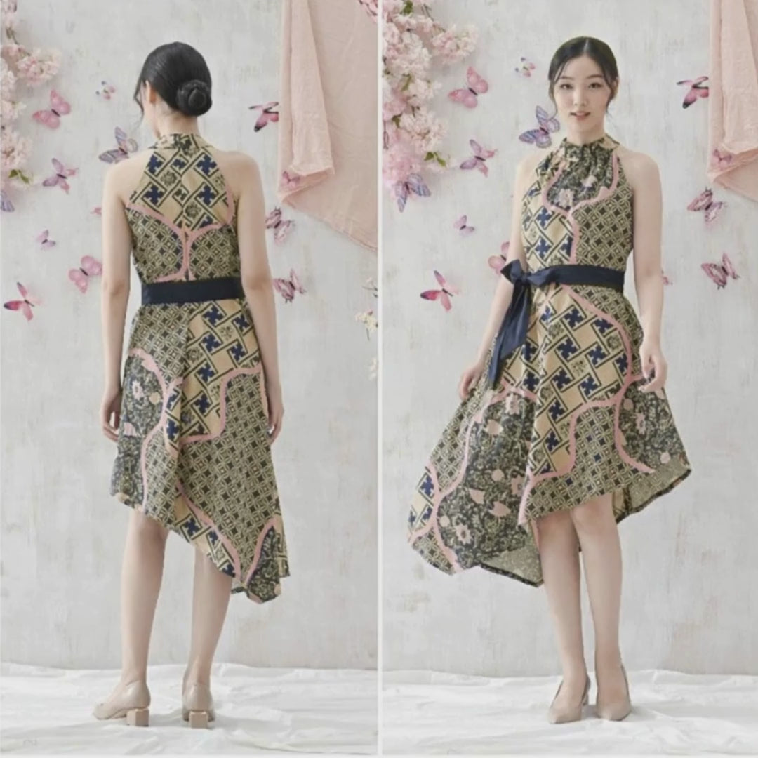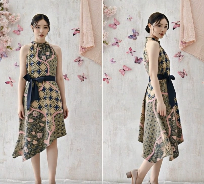 The Butterfly Grace Halter Dress is a perfect fusion of modern elegance and cultural richness. Constructed from luxurious Batik fabric, this dress boasts a high neckline and asymmetrical hem, offering a contemporary silhouette. The vibrant blend of soft pink and deep blue batik patterns captures the essence of traditional artistry, while the black waist sash adds definition and enhances the overall fit.