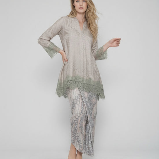 Delicate lace trims adorn the hem and sleeves of the top, adding a touch of feminine charm and refinement. The top flows gracefully in an A-line silhouette, paired with a batik pario wrap skirt that embodies timeless elegance with a contemporary twist.